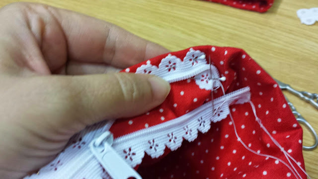 Uy. Aquí me falta una foto, pero yo no vuelvo a empezar (veis por qué no me gusta blogger), despuées hay que coser el bolsillo y la parte de arriba de la cremallera a la tela del bolso. Un par de fotos más abajo podéis ver la posición aproximada del bolsillo. Yo he rematado los extremos de la cremallera con un trocito de bies doblado y cosido a la tela del bolso. Ahora marcamos con la plancha un dobladillo de 1 cm todo en derredor (comprobar las medida antes de coser).